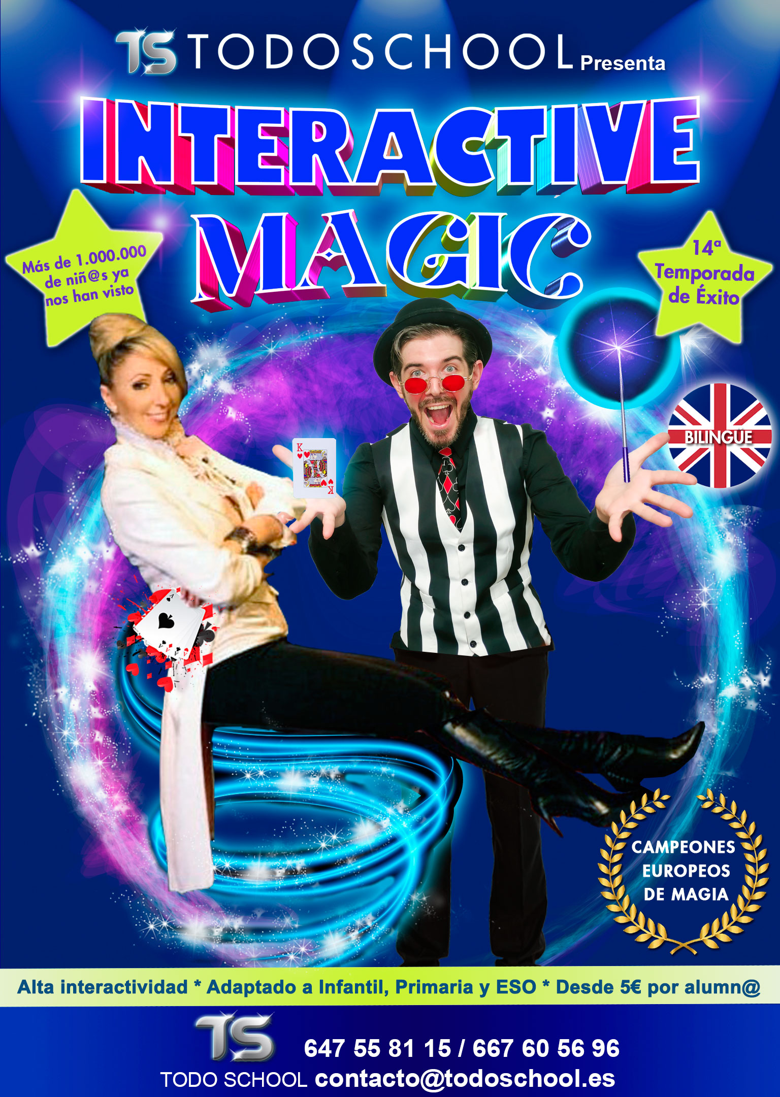 INTERACTIVE MAGIC es un espectáculo divertido y didáctico que está dirigido a alumn@s entre 2 y 16 años ( se adapta a cada etapa evolutiva ) y que oferta una gran variedad de temáticas destacando HALLOWEEN E INTERACTIVE MAGIC,en los cuales, se fomenta en todo momento la participación del alumnado.