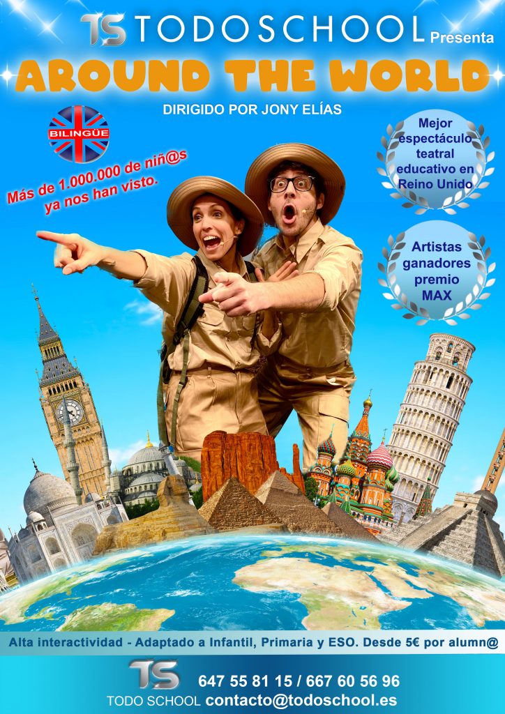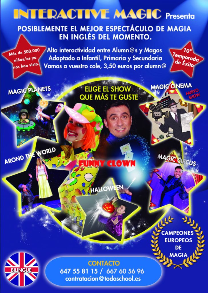 La mayoría de nuestros más de 25 espectáculos se pueden realizar en inglés o castellano, en varios pases por días y adaptándonos a los diferentes niveles educativos ( Infantil, Primaria y ESO) y espacios de los que dispone el colegio o instituto o, si lo prefieres, desplazándote a los teatros que tenemos concertados.