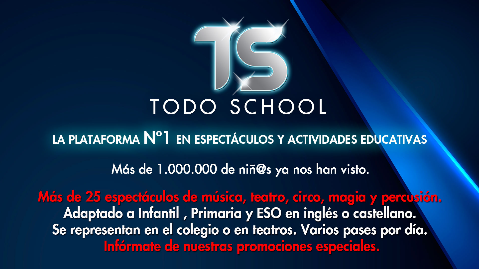 TodoSchool es una plataforma educativa con más de 20 años de experiencia que surge de la fusión de grandes profesionales del mundo de la docencia ( profesores , pedagogos) y los mejores artistas de las más prestigiosas compañías de las artes escénicas ( ARA MALIKIAN, YLLANA, TÖTHEM COMPANY, TRASH, CIRQUE DU SOLEIL, FAMA, FEDRIANI, DREAM MAKERS, JUAN “D” Y BEATRIZ…) y empresas de tiempo libre.