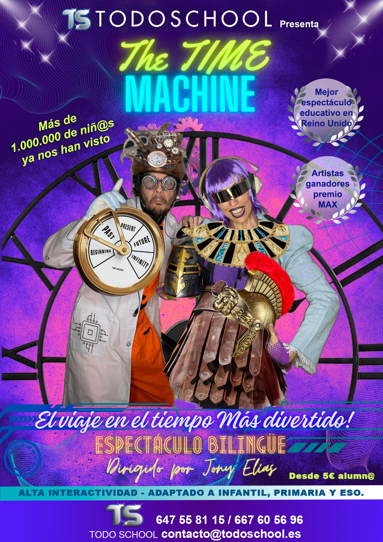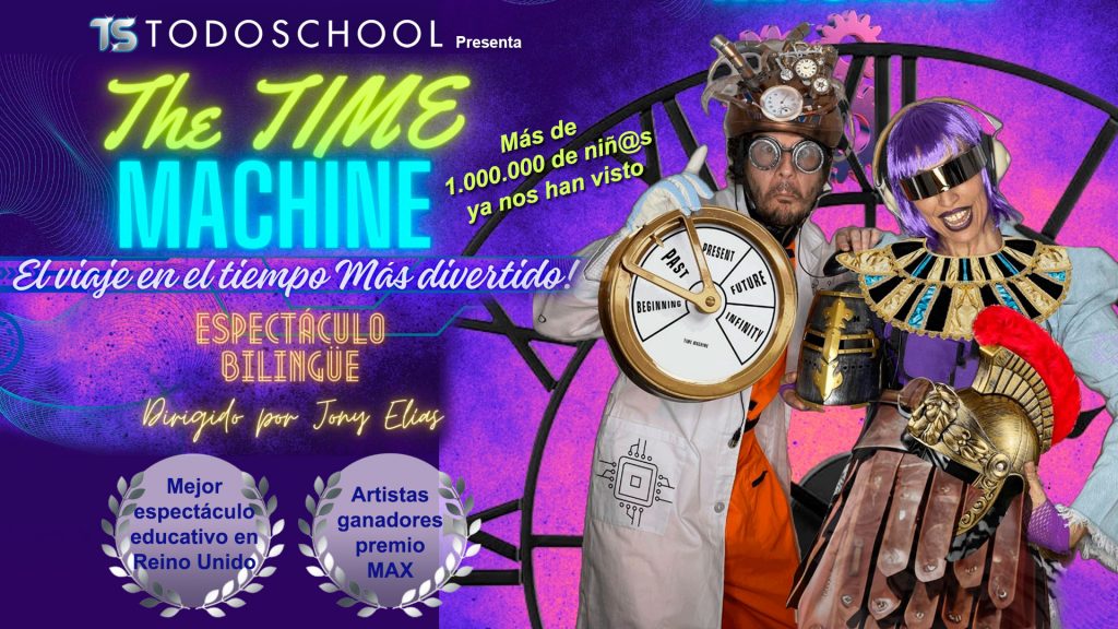 Así comienza nuestro nuevo espectáculo THE TIME MACHINE lleno de humor, interacción, slapstick, energía, sincronización, juegos y efectos escénicos, gags, y teatralidad a raudales donde es muy importante la participación activa del público que les tendrá que ayudar a resolver los pequeños contratiempos que se encontrarán en sus viajes por diferentes épocas de la historia, descifrar misterios y, sobre todo, que no sean descubiertos como “viajeros en el tiempo”.